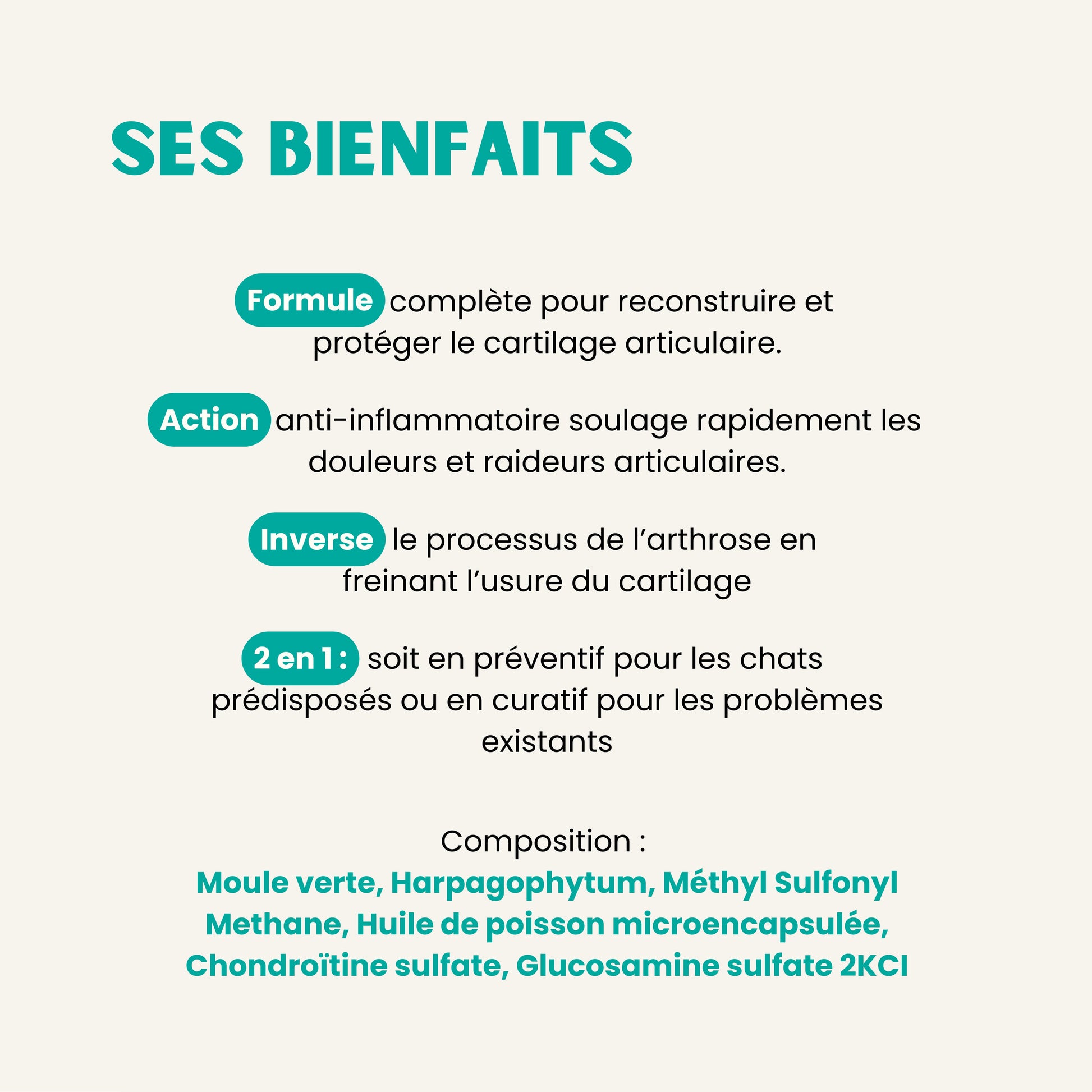 • Chondroïtine sulfate (10 %) – Protège le cartilage et freine son usure
