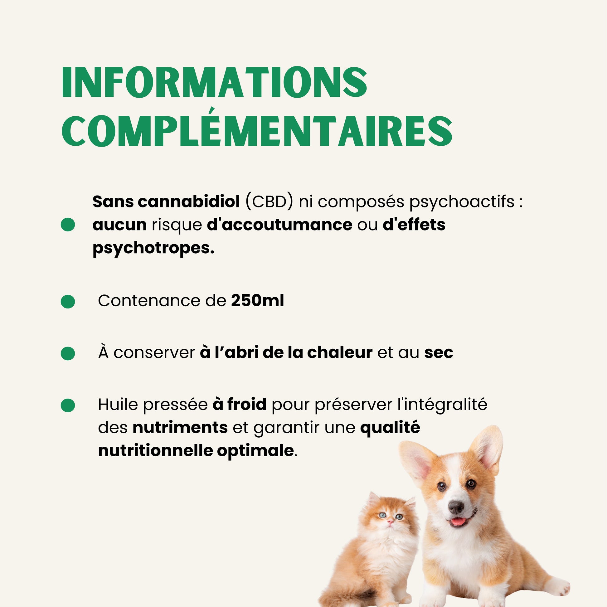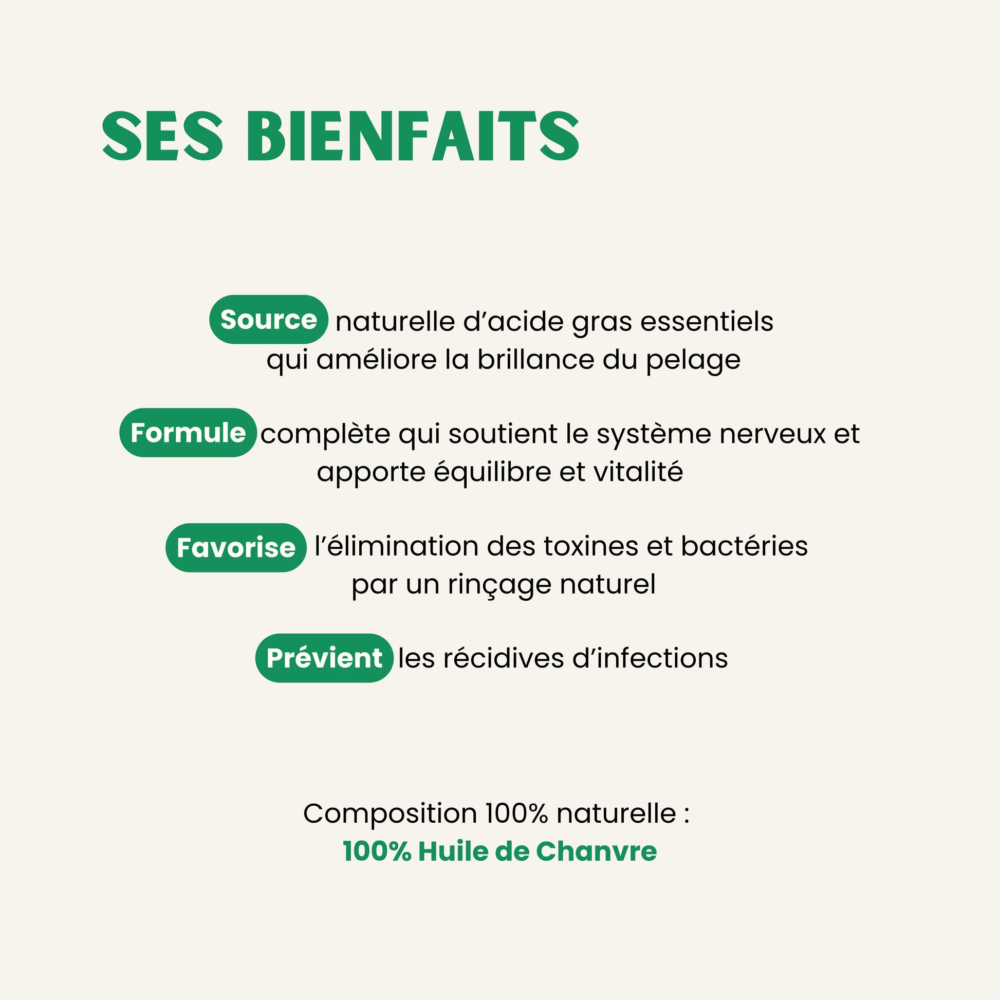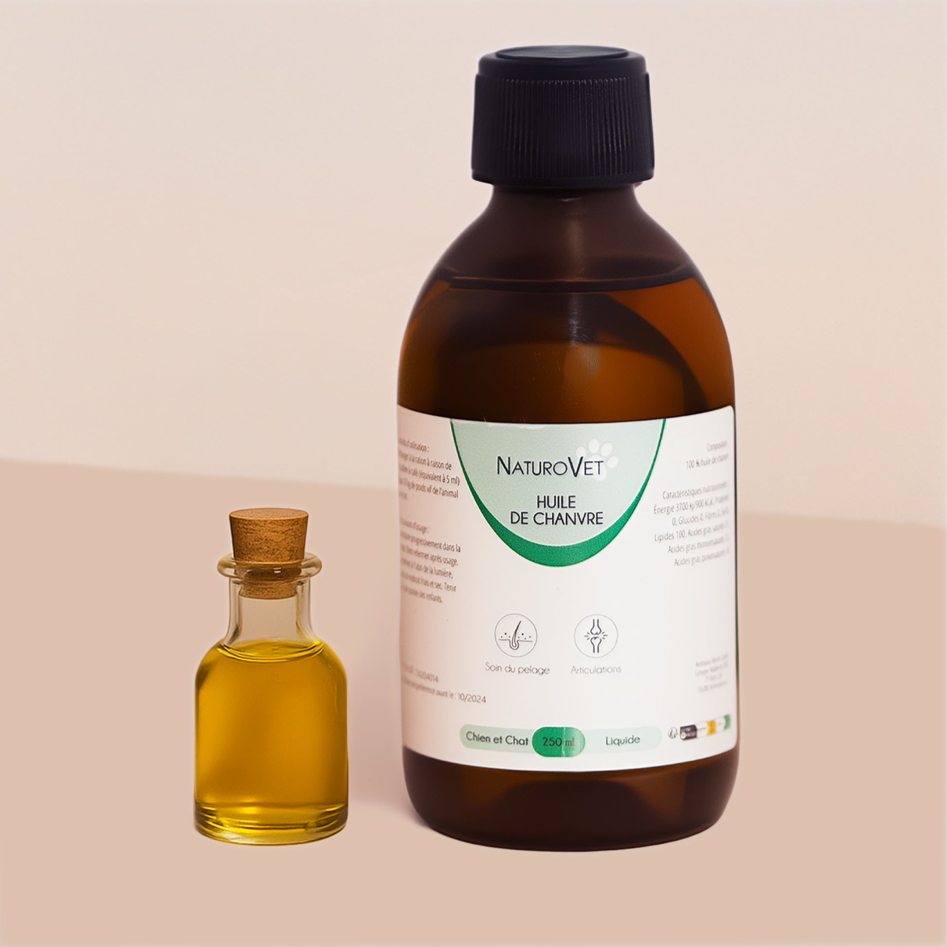 Huile extraite de graines de chanvre, riche en acides gras essentiels pour accompagner la vitalité de votre compagnon.