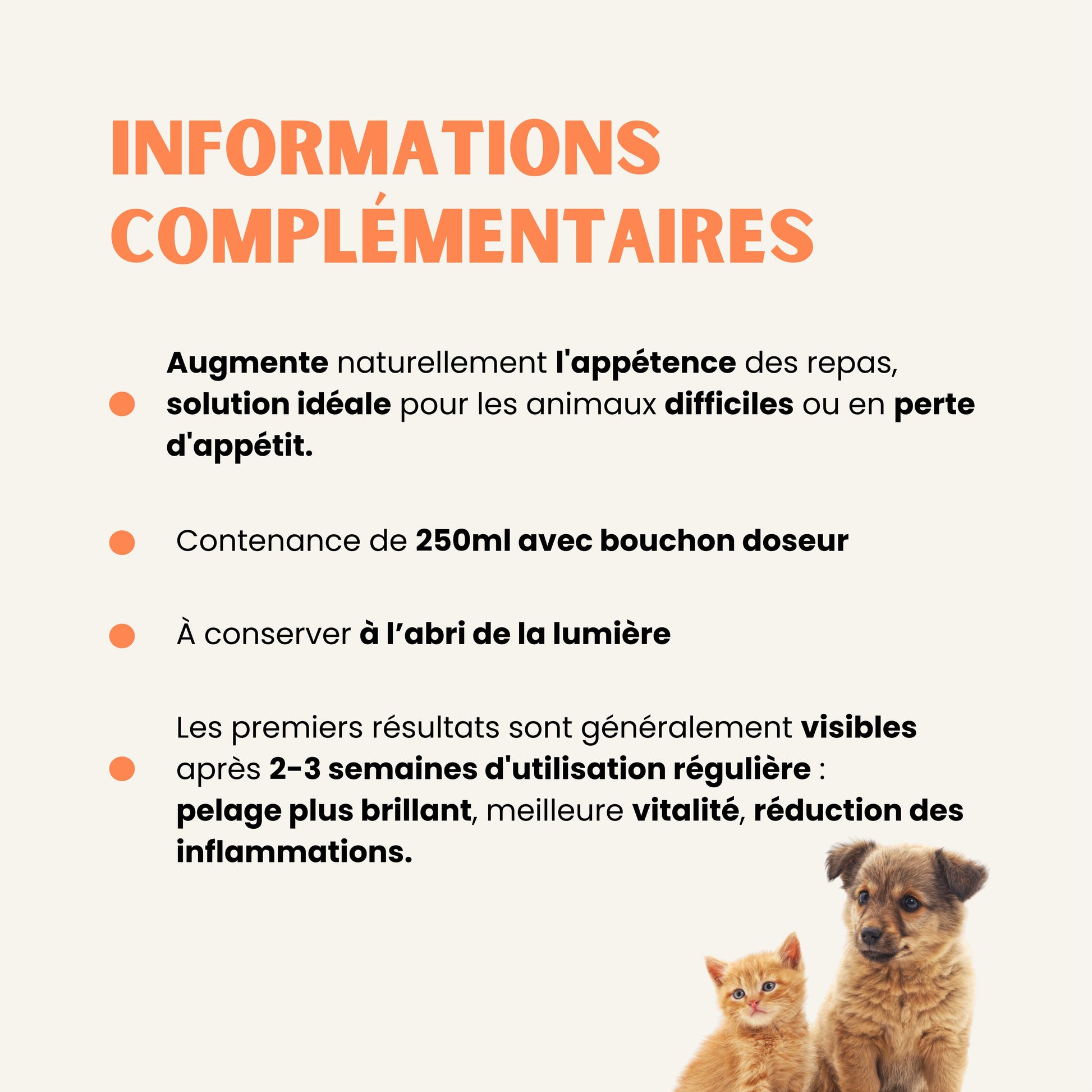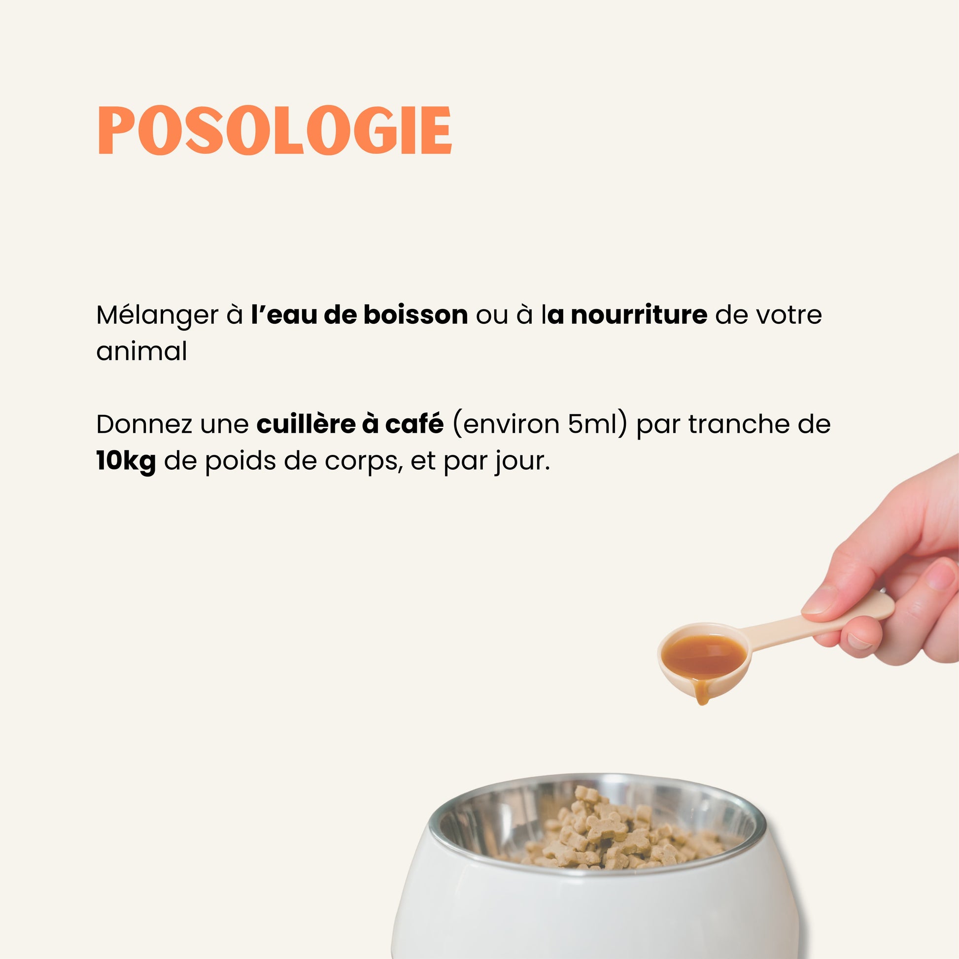 • 5 kg → ½ cuillère à café (≈ 2,5 ml) / jour