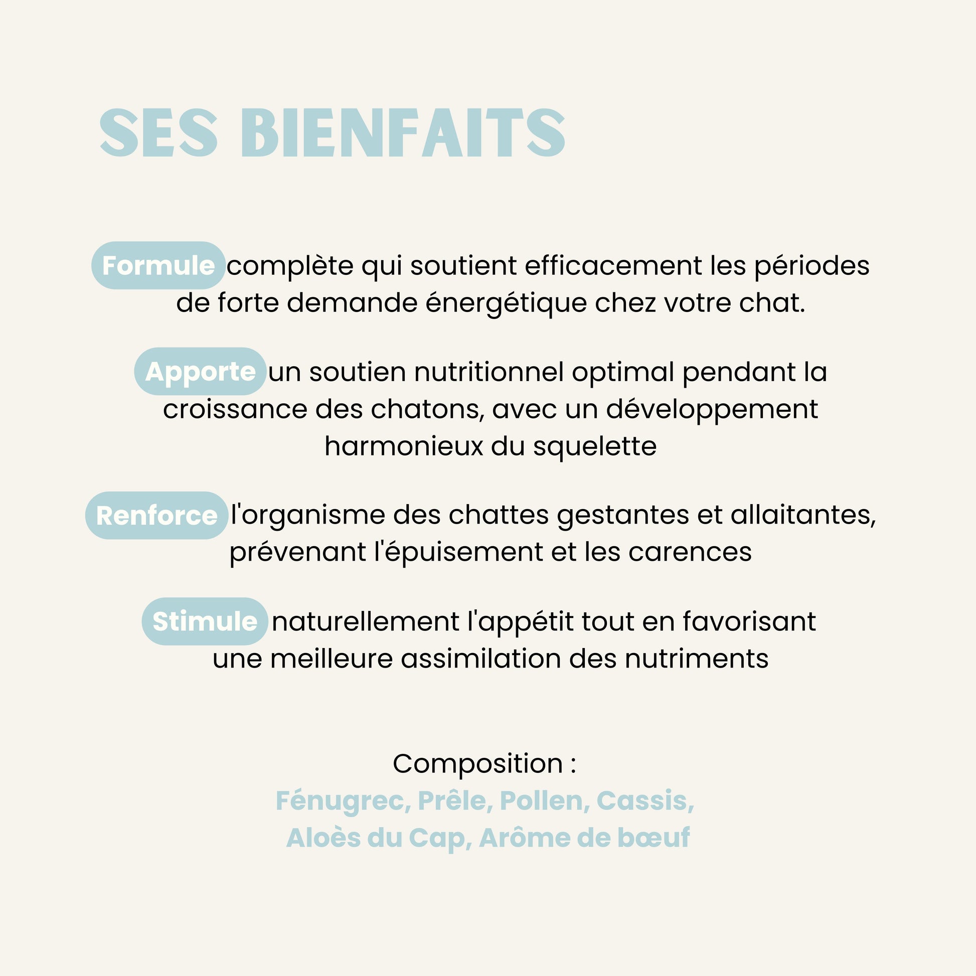 📦 Composition complète : Fenugrec 35 %, Prêle 25 %, Pollen 20 %, Cassis 10 %, Protéine de foie de poulet 10 %.