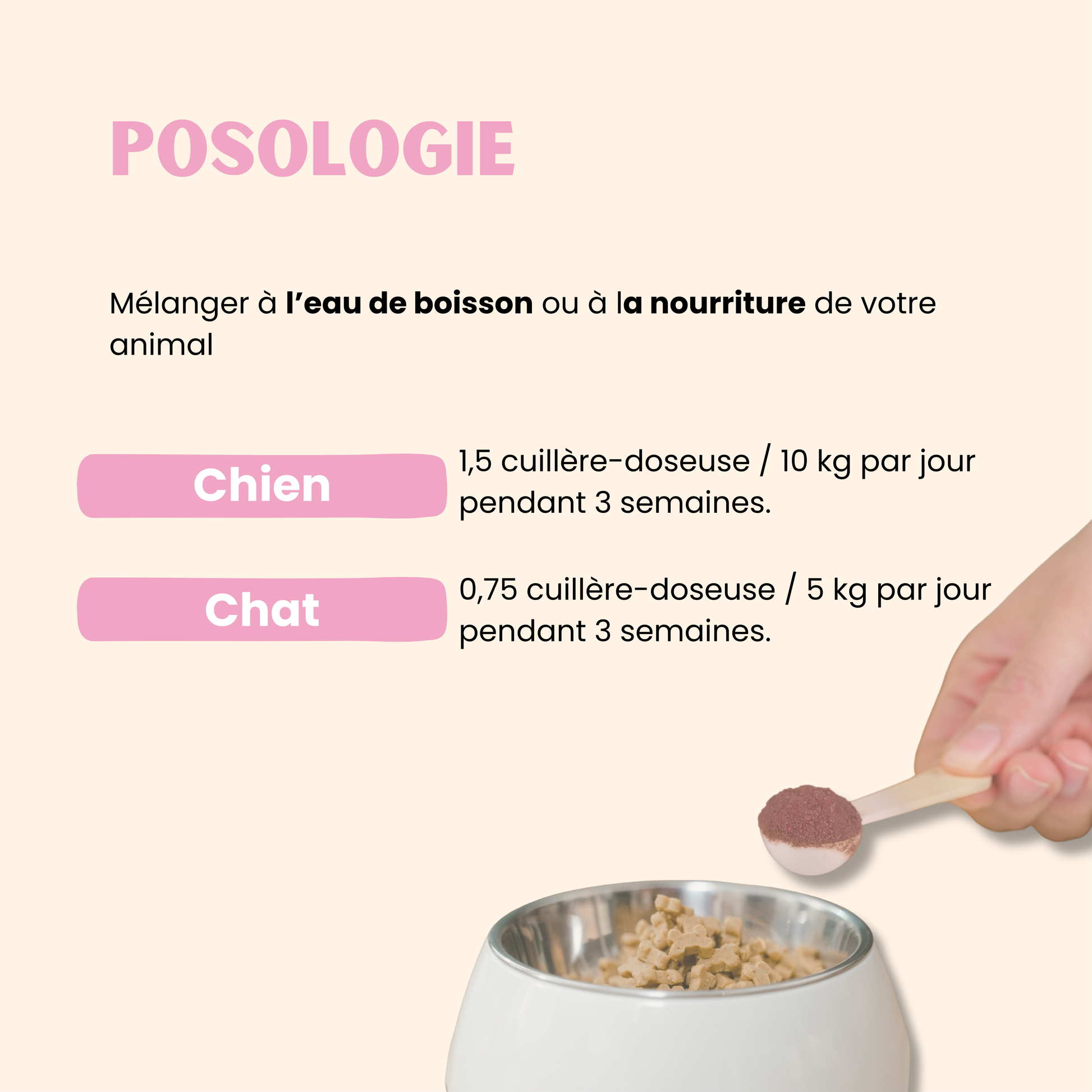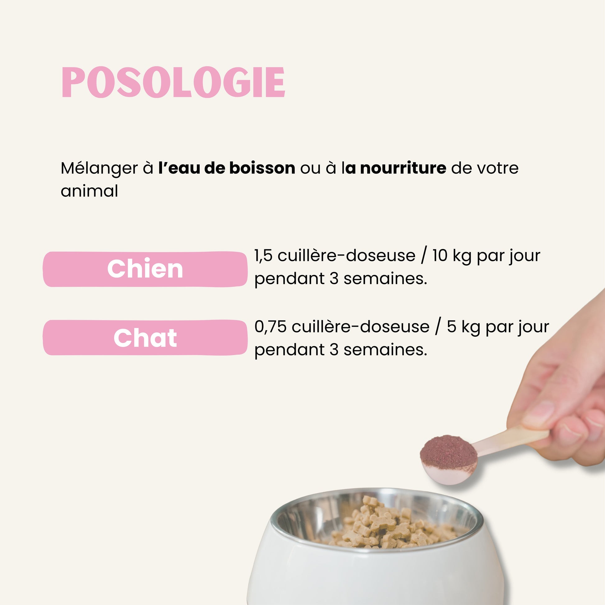 0,75 cuillère-doseuse / jour pour un chat de 5 kg pendant 3 semaines.