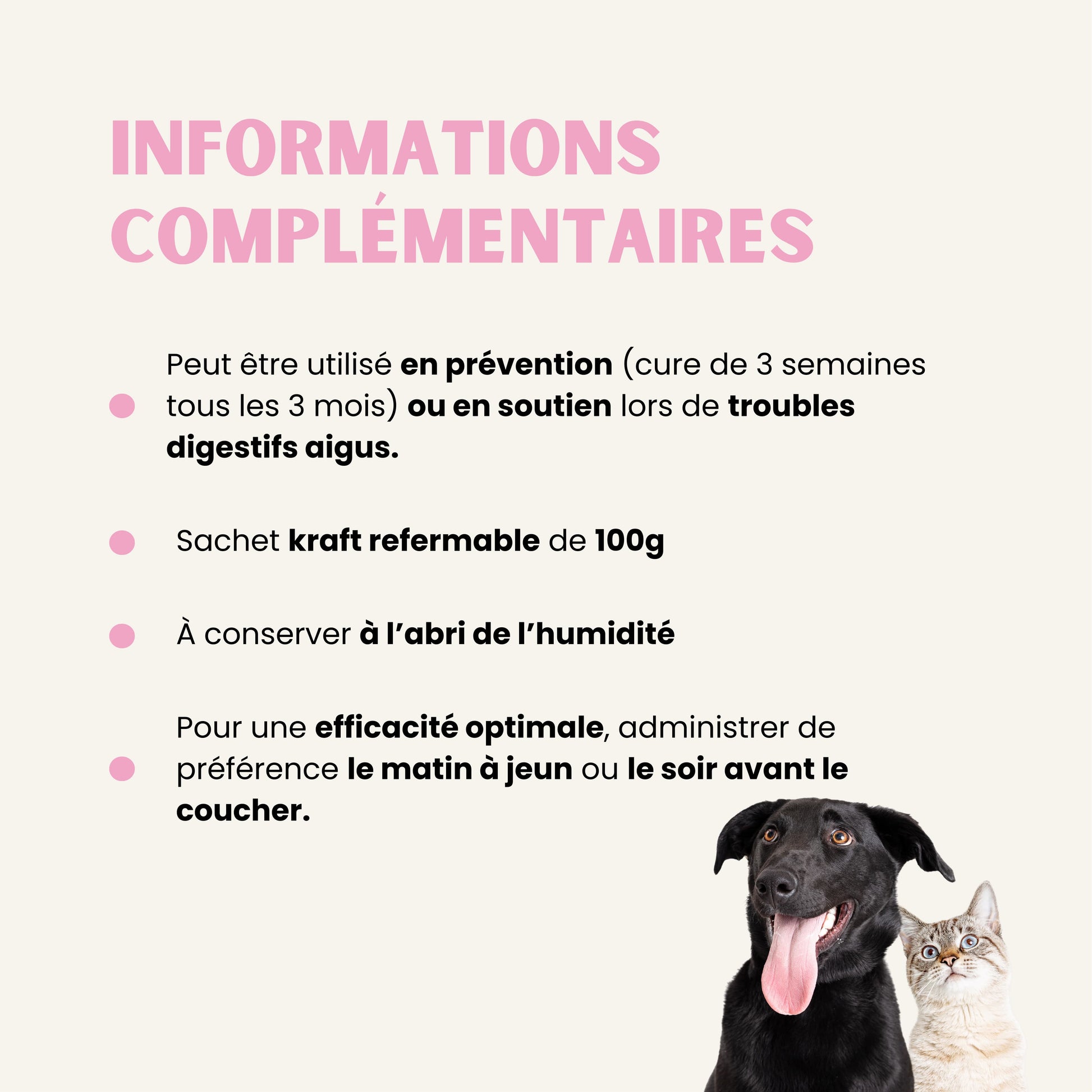 • Réduit les troubles digestifs (diarrhées, flatulences, ballonnements…).