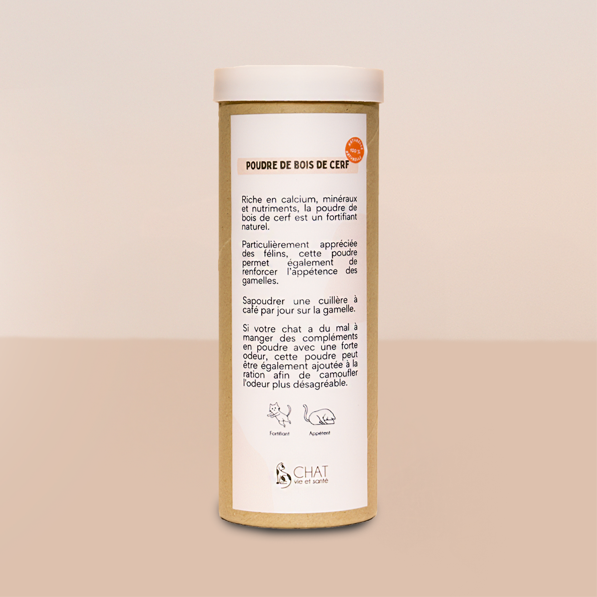 La Poudre de Bois de Cerf est un fortifiant naturel idéal pour soutenir la santé et la vitalité des chiens et chats.