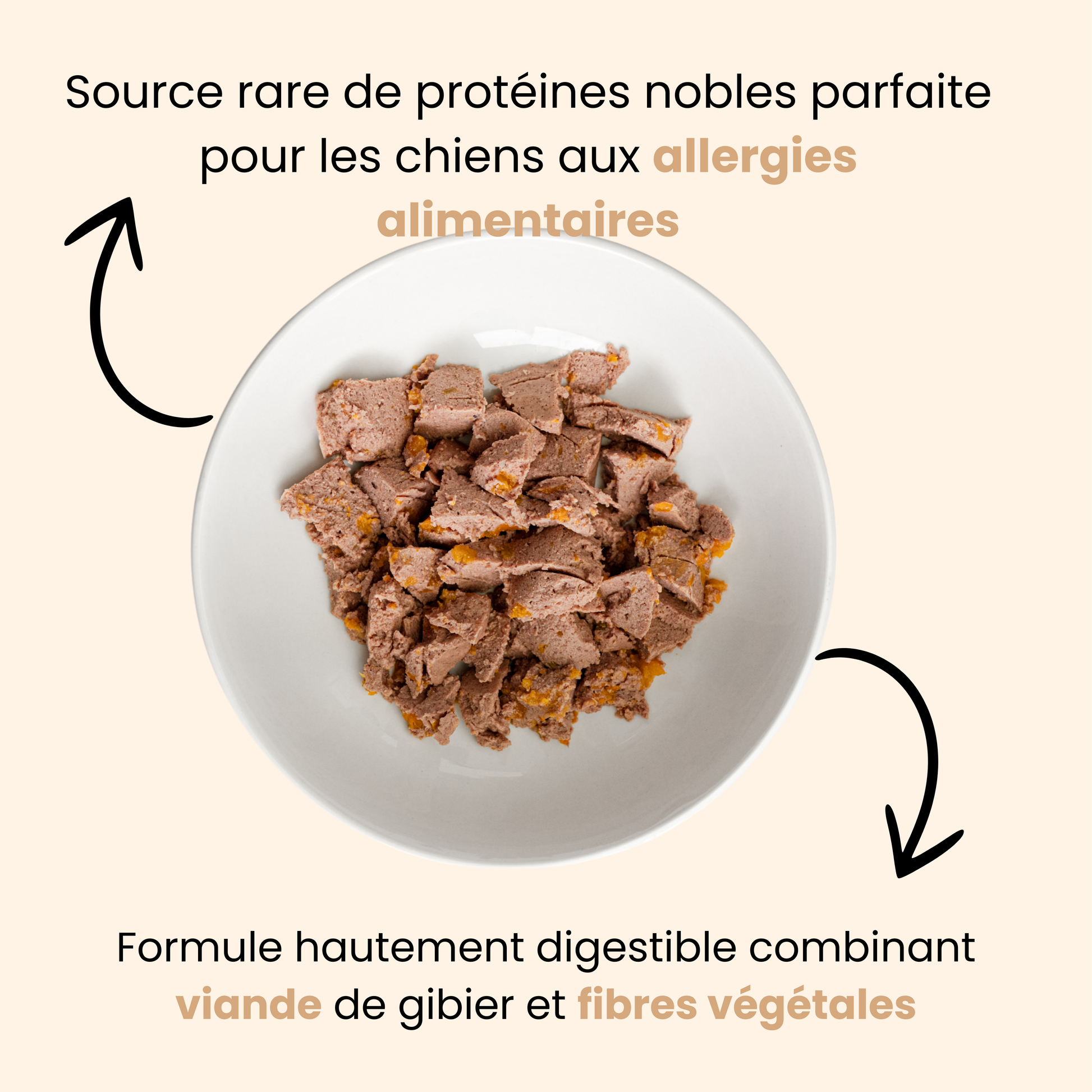 • 🐦 : viande maigre et savoureuse, riche en protéines de haute qualité pour le développement musculaire, en fer et phosphore pour la santé osseuse et le métabolisme ; excellente source de protéines alternatives pour les chiens sensibles ou allergiques