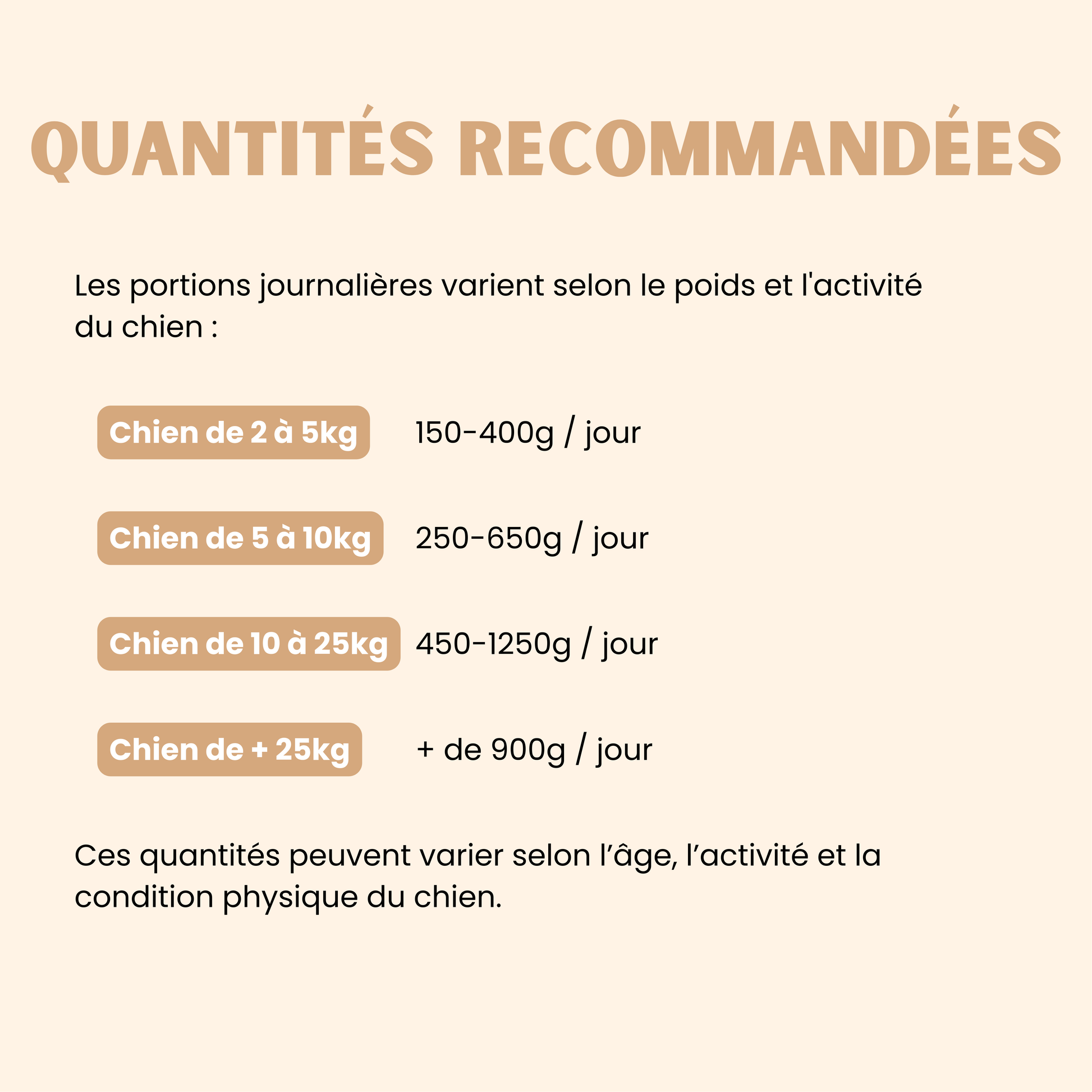 • 25 kg : +900 g/jour (à ajuster selon appétit et activité)