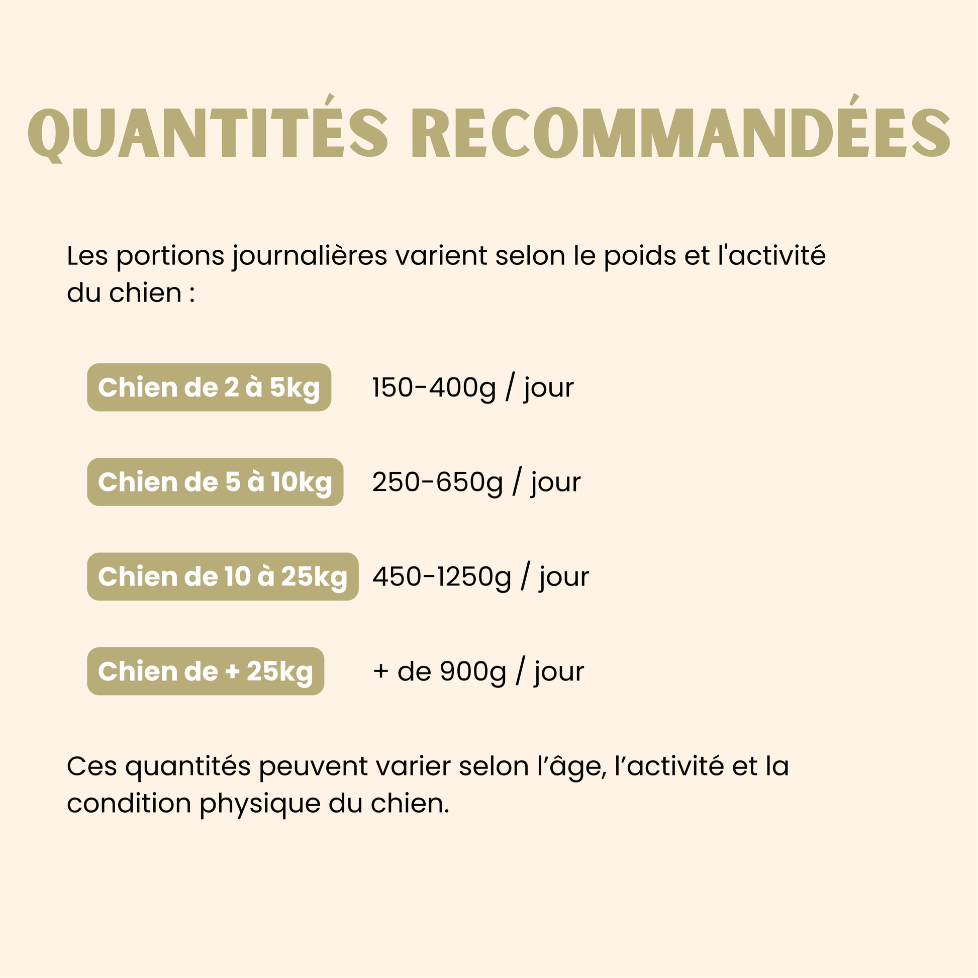 • 25 kg : +900 g/jour (à ajuster selon appétit et activité)