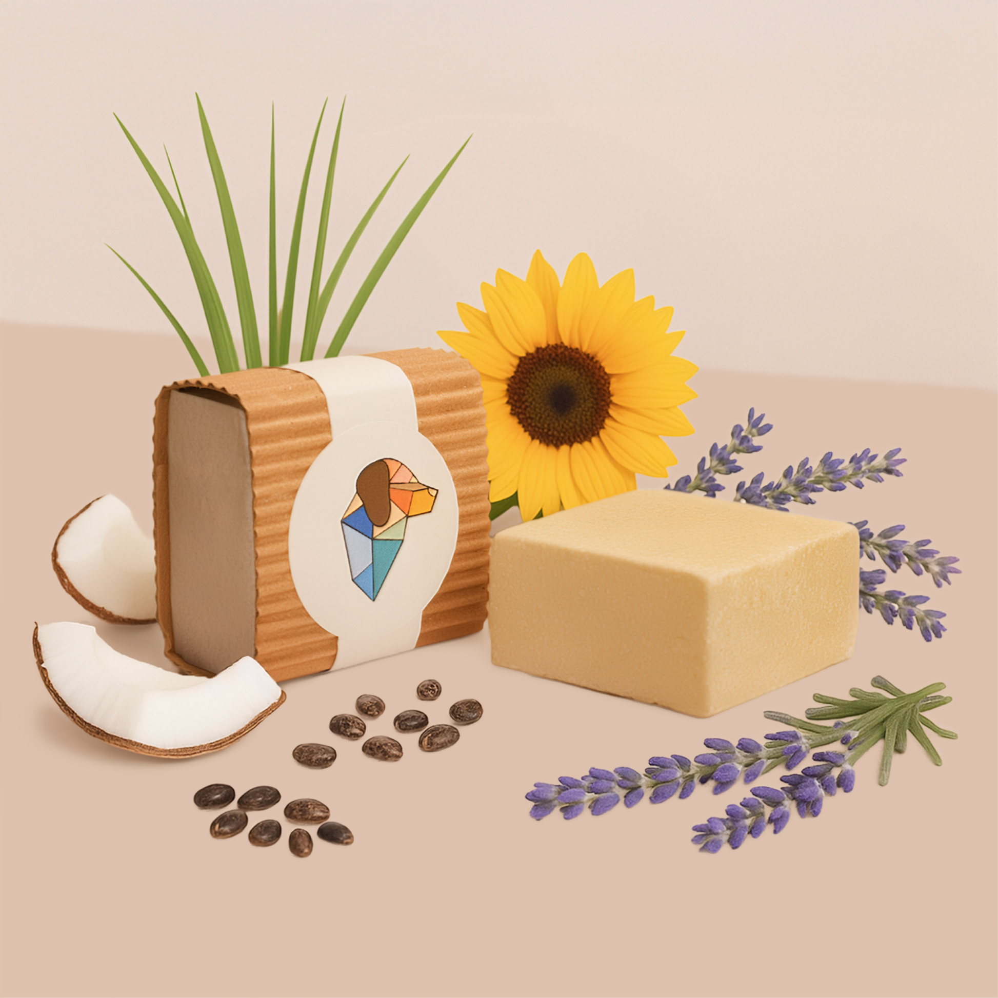 Ce shampoing solide antiparasitaire est spécialement formulé pour prendre soin de la peau et du pelage de ton chien tout en le protégeant naturellement contre les parasites externes.