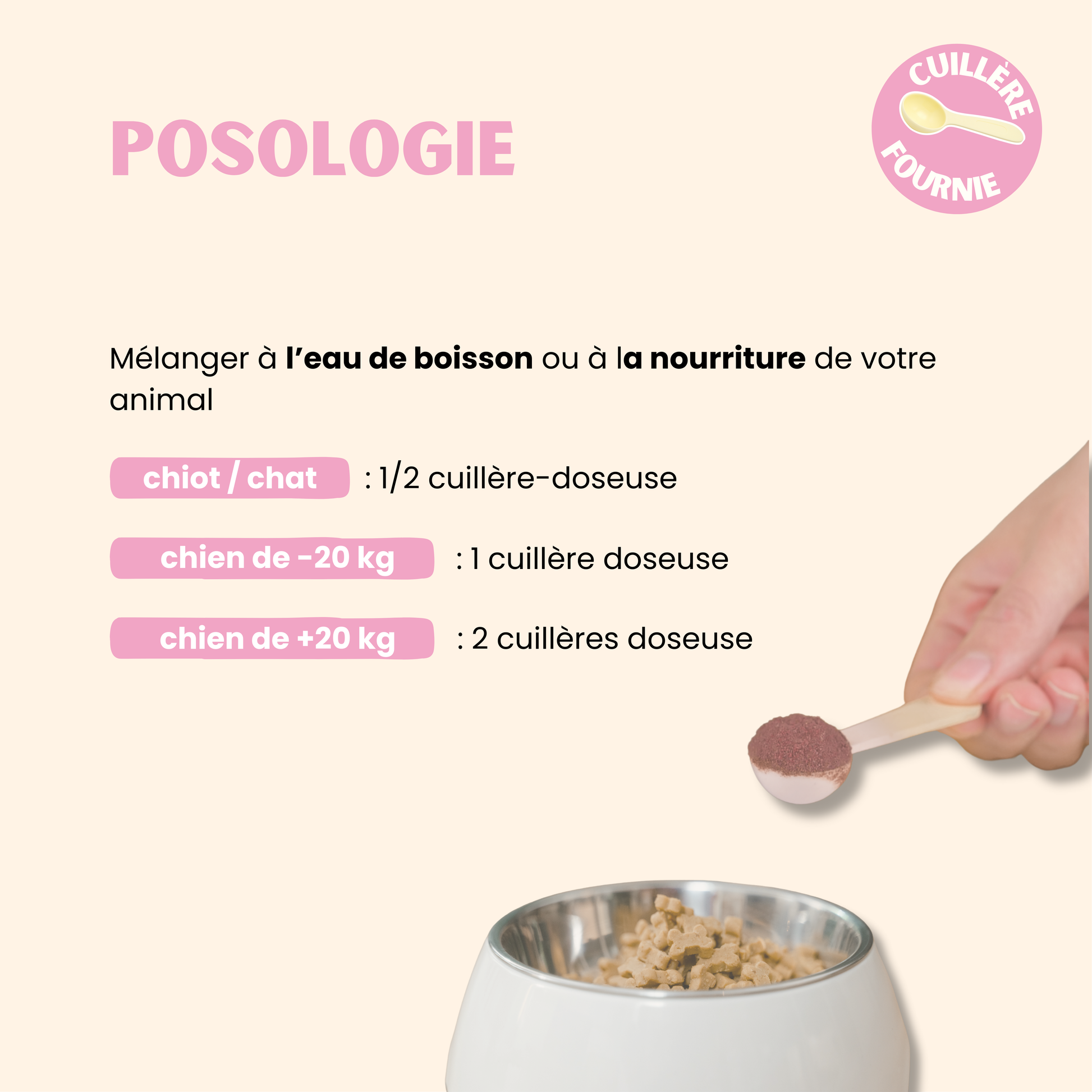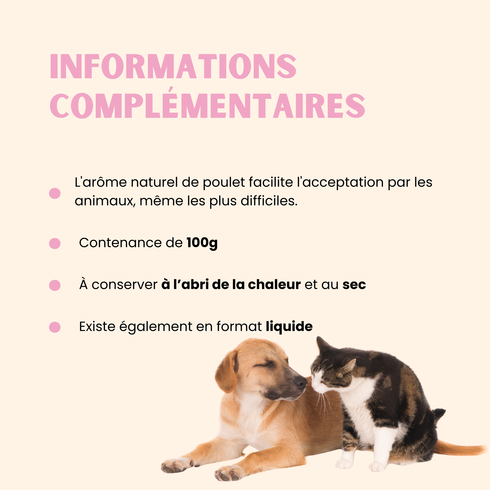 💡 Disponible en poudre ou en liquide, cette synergie s’adapte aux préférences de votre compagnon et se mélange facilement à sa nourriture.