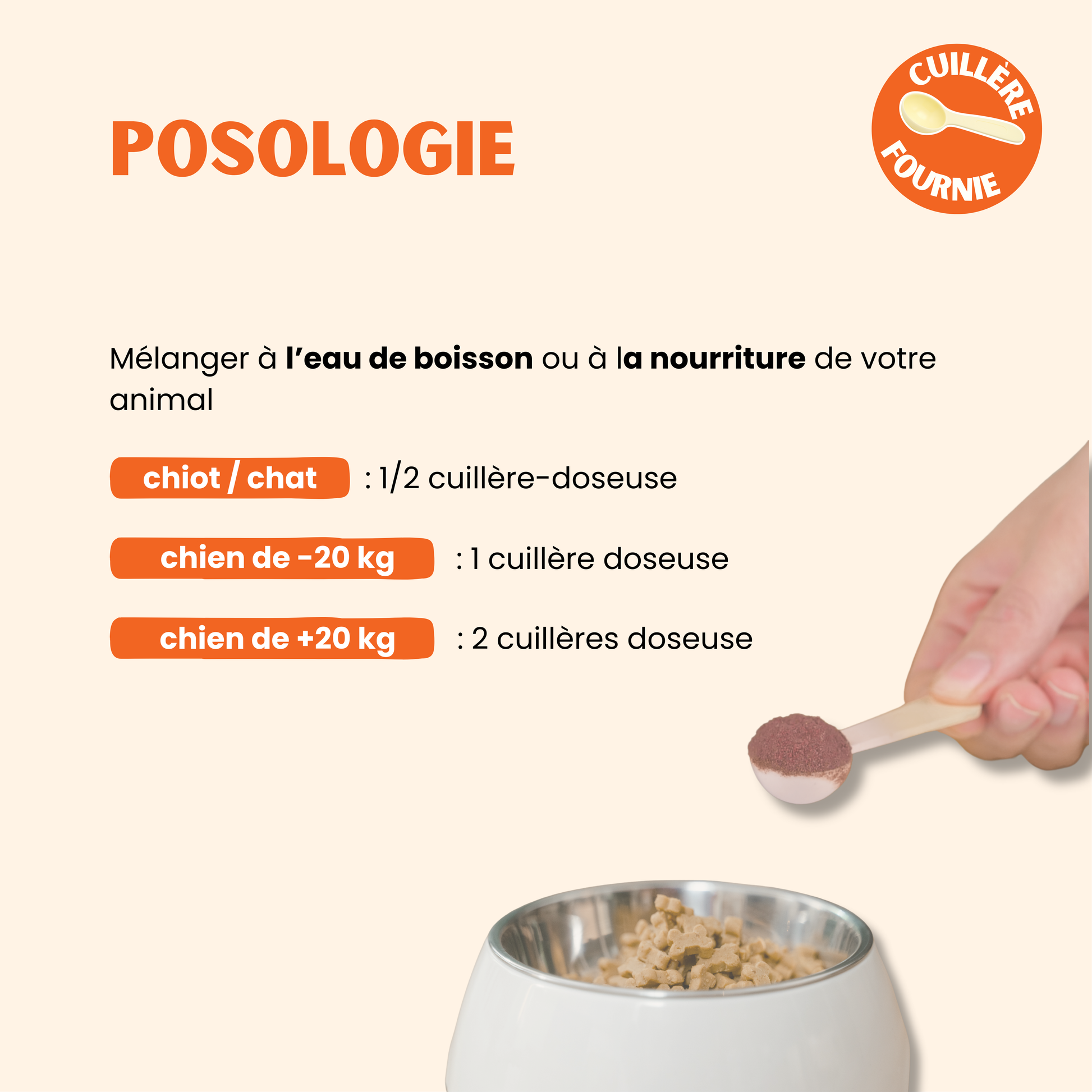 ≥ 20 kg : 2 cuillères-doseuses / jour💡 Mélanger à la nourriture ou à l’eau, sur une cure d’un mois, renouvelable si nécessaire.