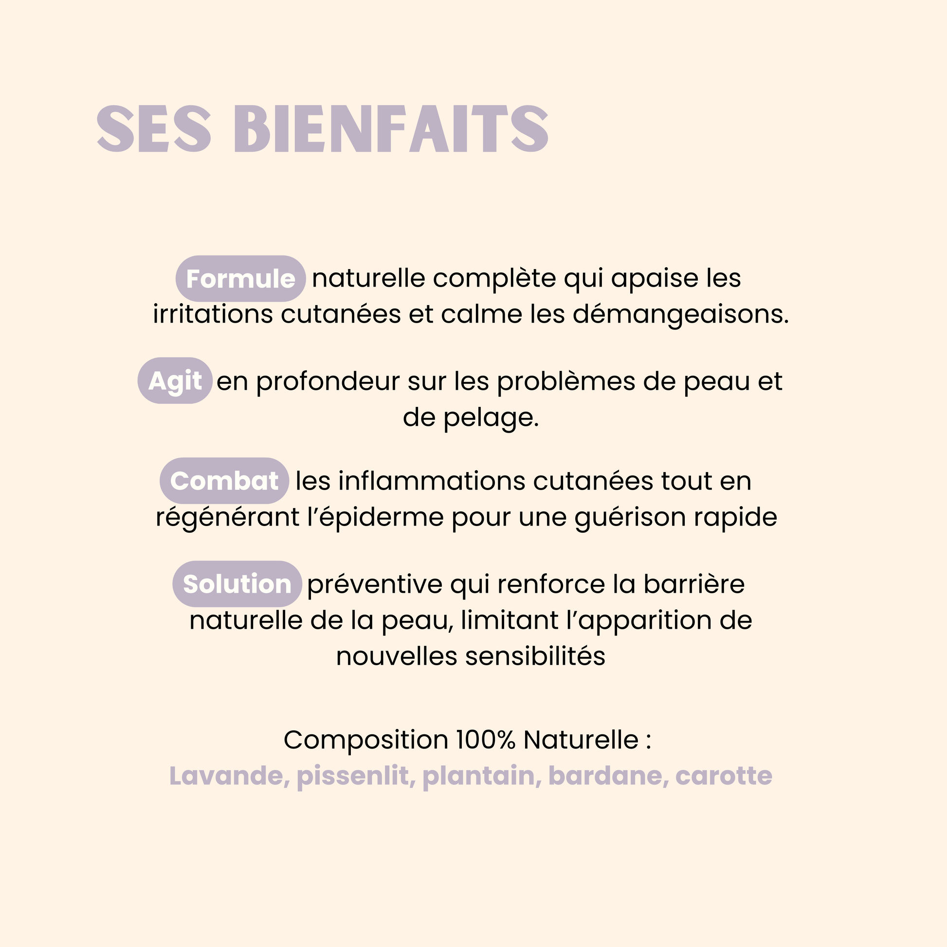Le Complexe Épiderme est un complément alimentaire 100 % naturel qui aide à protéger, assainir et apaiser la peau de votre compagnon 🐾.
