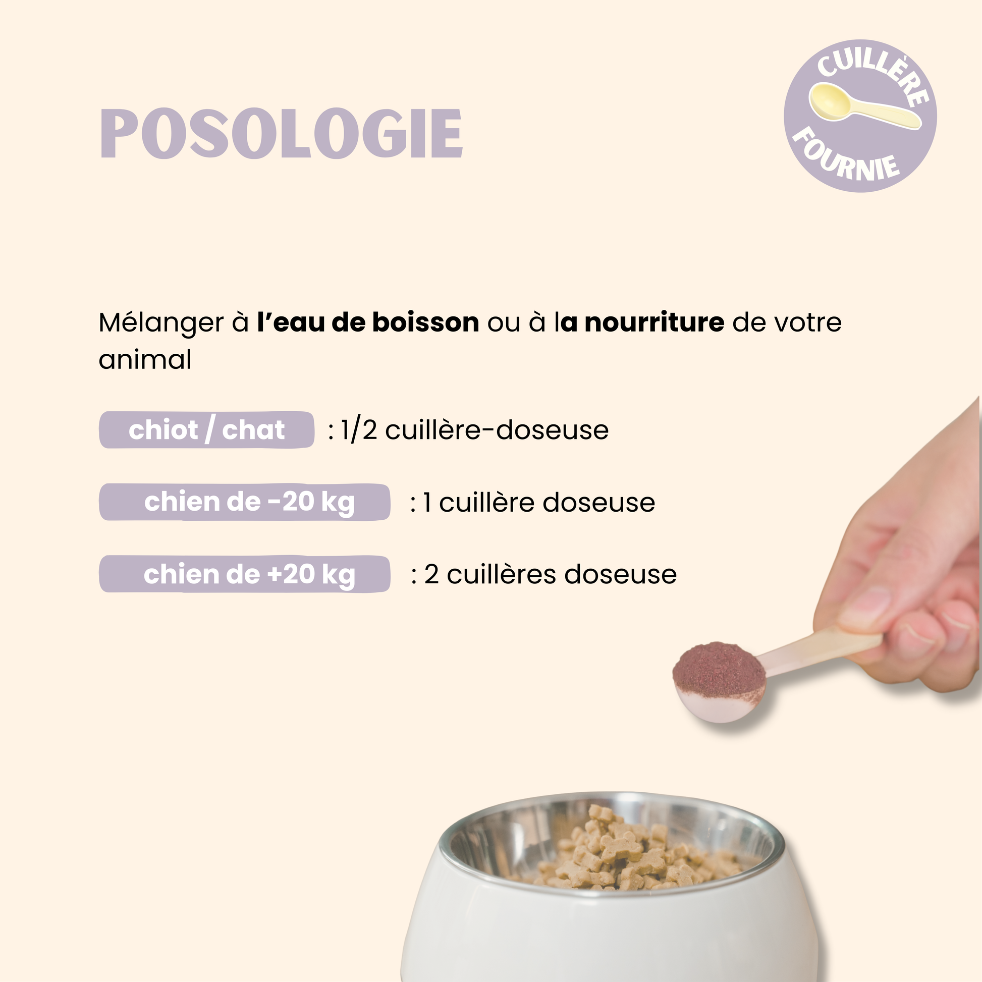 • Chien -20 kg : 1 cuillère doseuse / jour