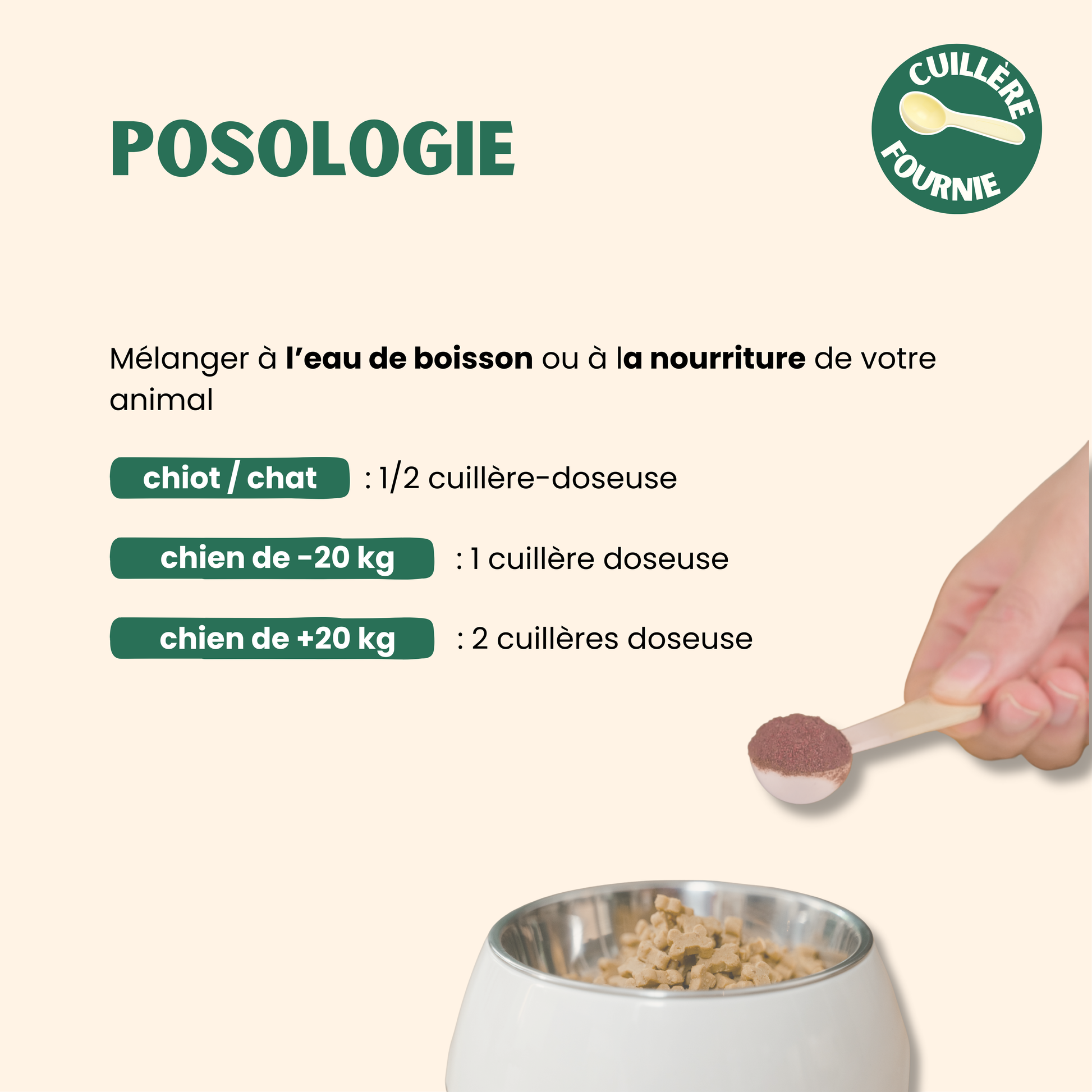 • Moins de 20 kg : 1 cuillère doseuse / jour