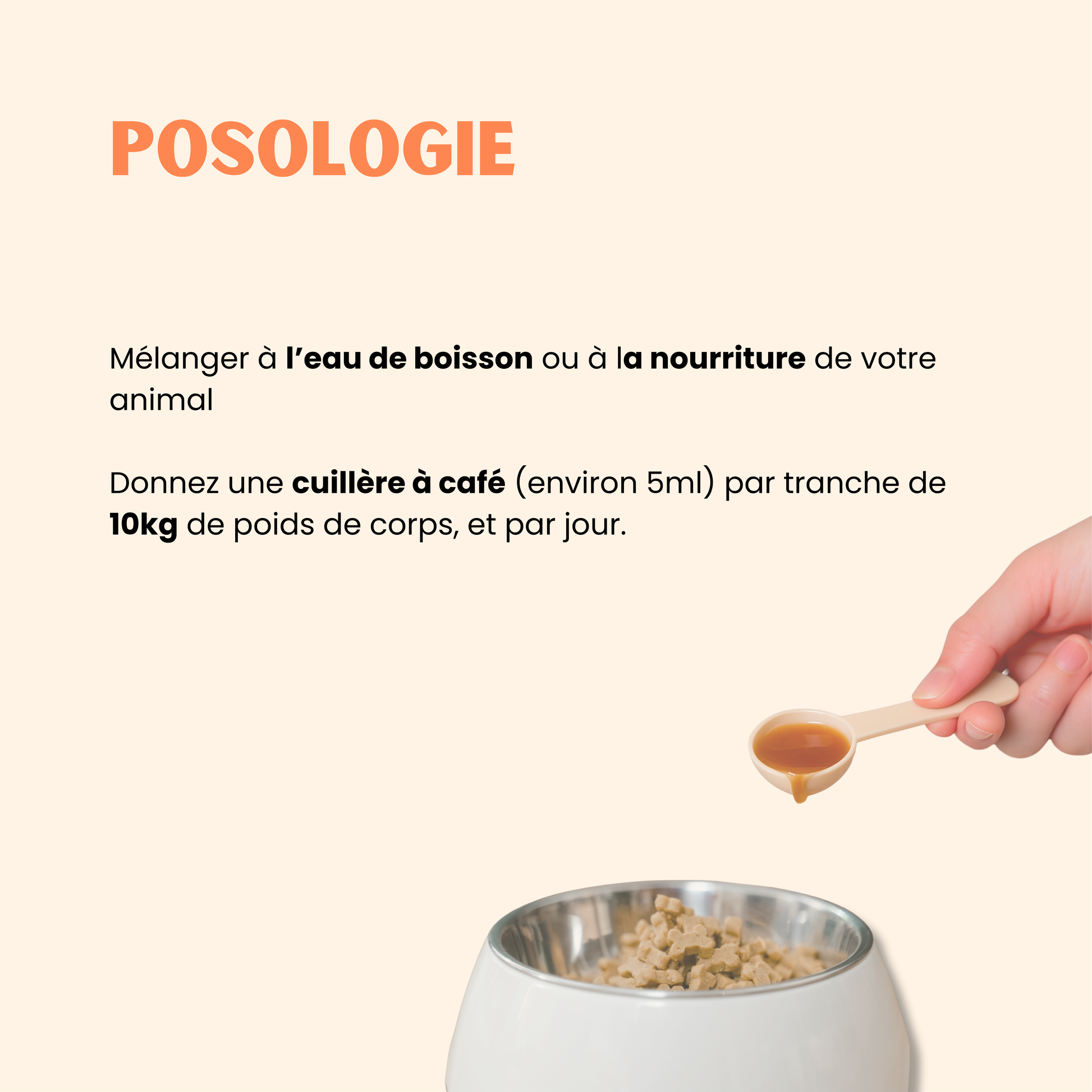 • 10 kg → 1 cuillère à café (≈ 5 ml) / jour