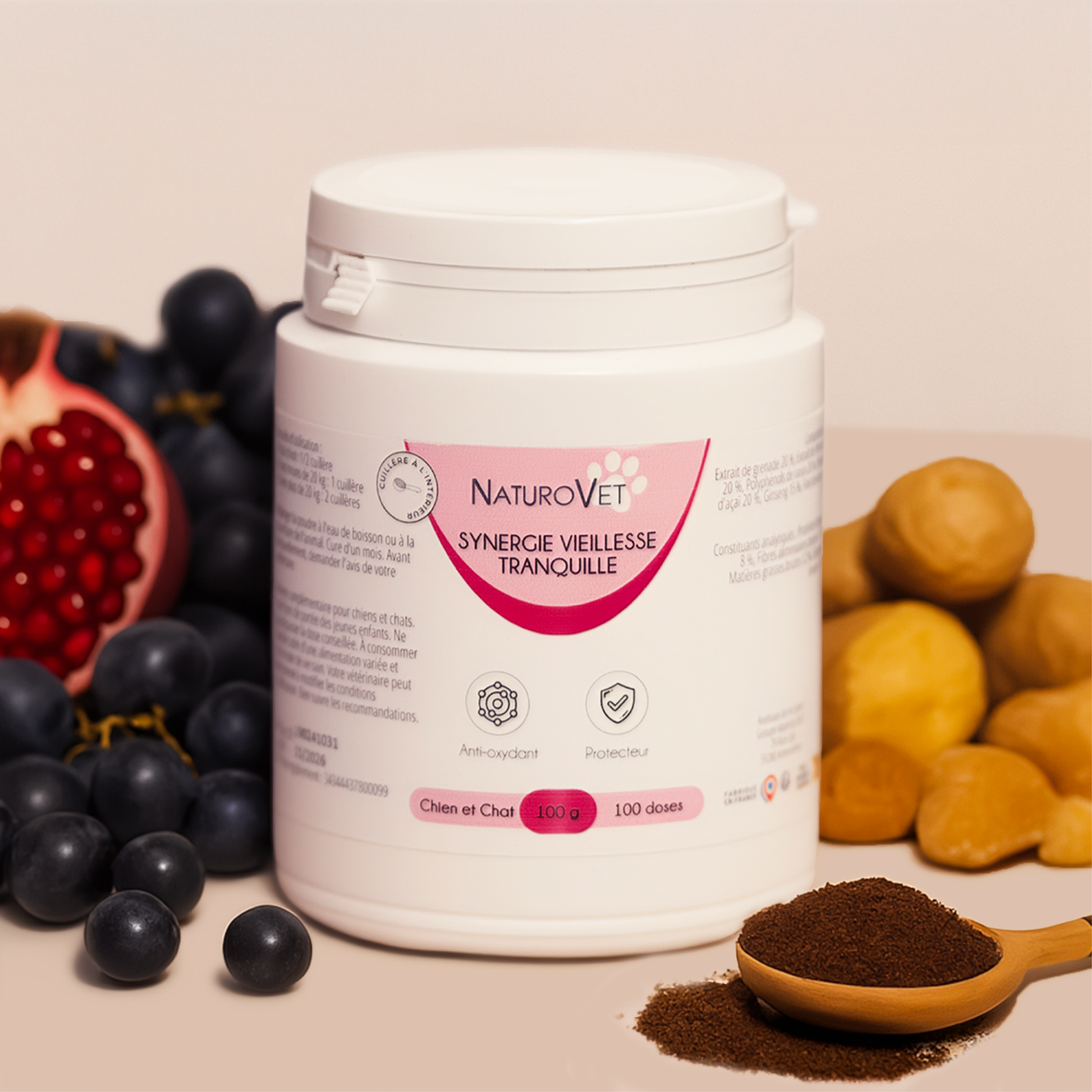 La Synergie Vieillesse Tranquille est un complément alimentaire naturel conçu pour accompagner les chiens et chats face aux effets du temps.