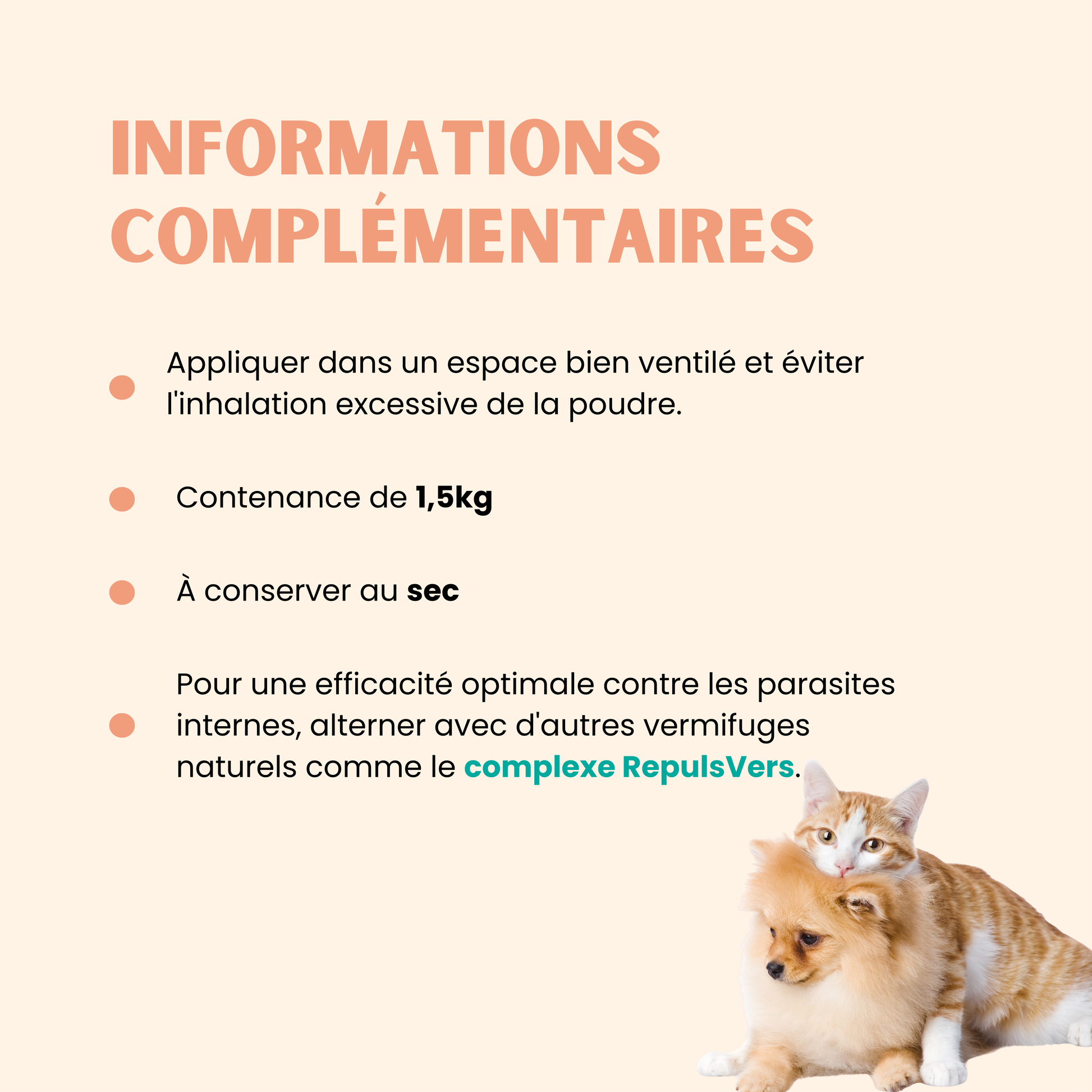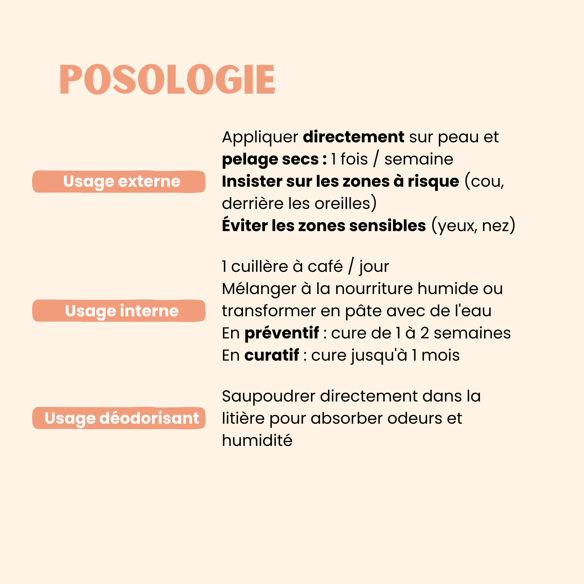 En usage externe, elle agit comme un insecticide physique naturel contre les puces et tiques : ses particules microscopiques pénètrent et détruisent l’exosquelette des parasites, provoquant leur déshydratation et leur mort. Elle peut aussi être utilisée comme désodorisant naturel, par exemple dans la litière du chat pour capturer les mauvaises odeurs.